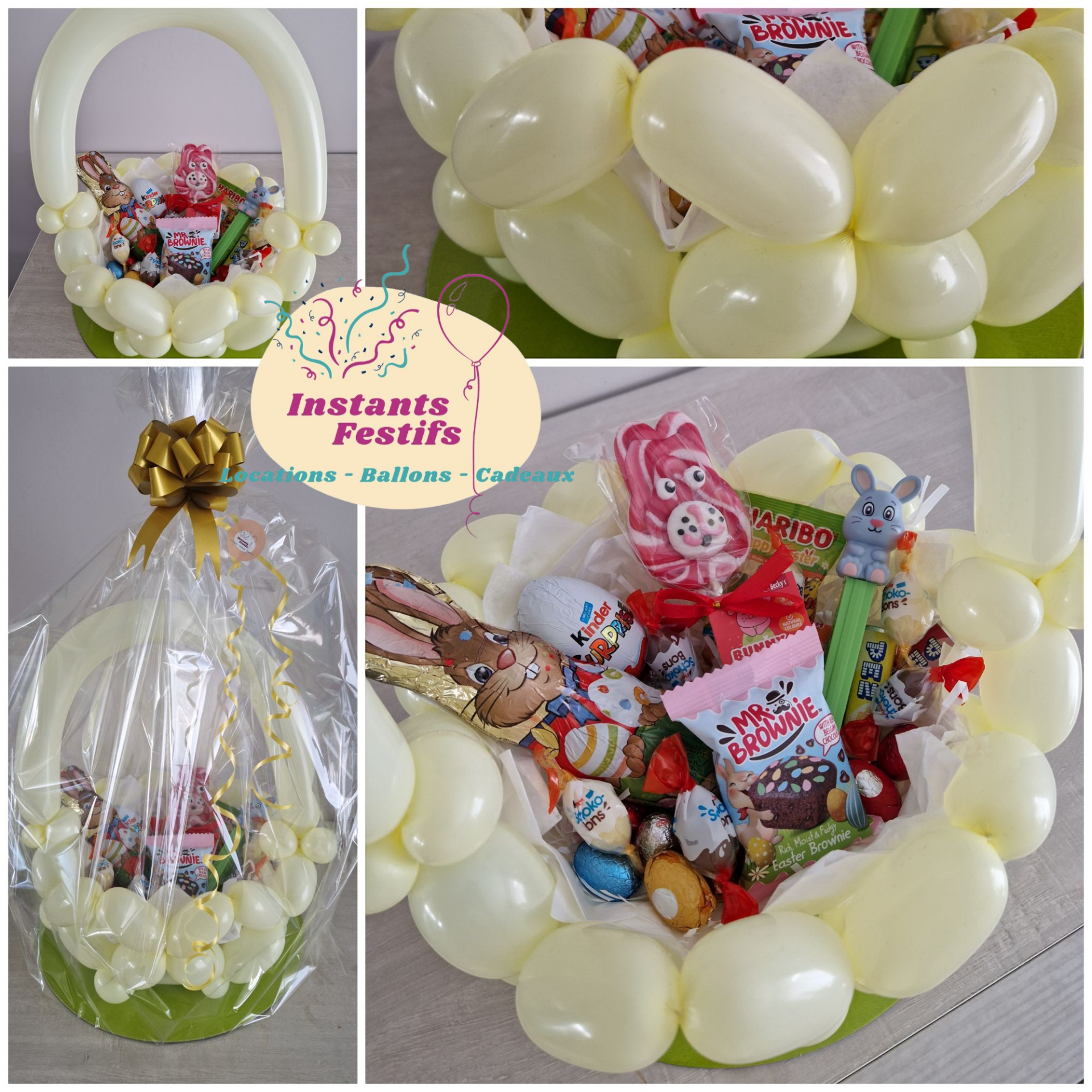 Panier de Pâques en ballons, remplis de confiseries diverses.