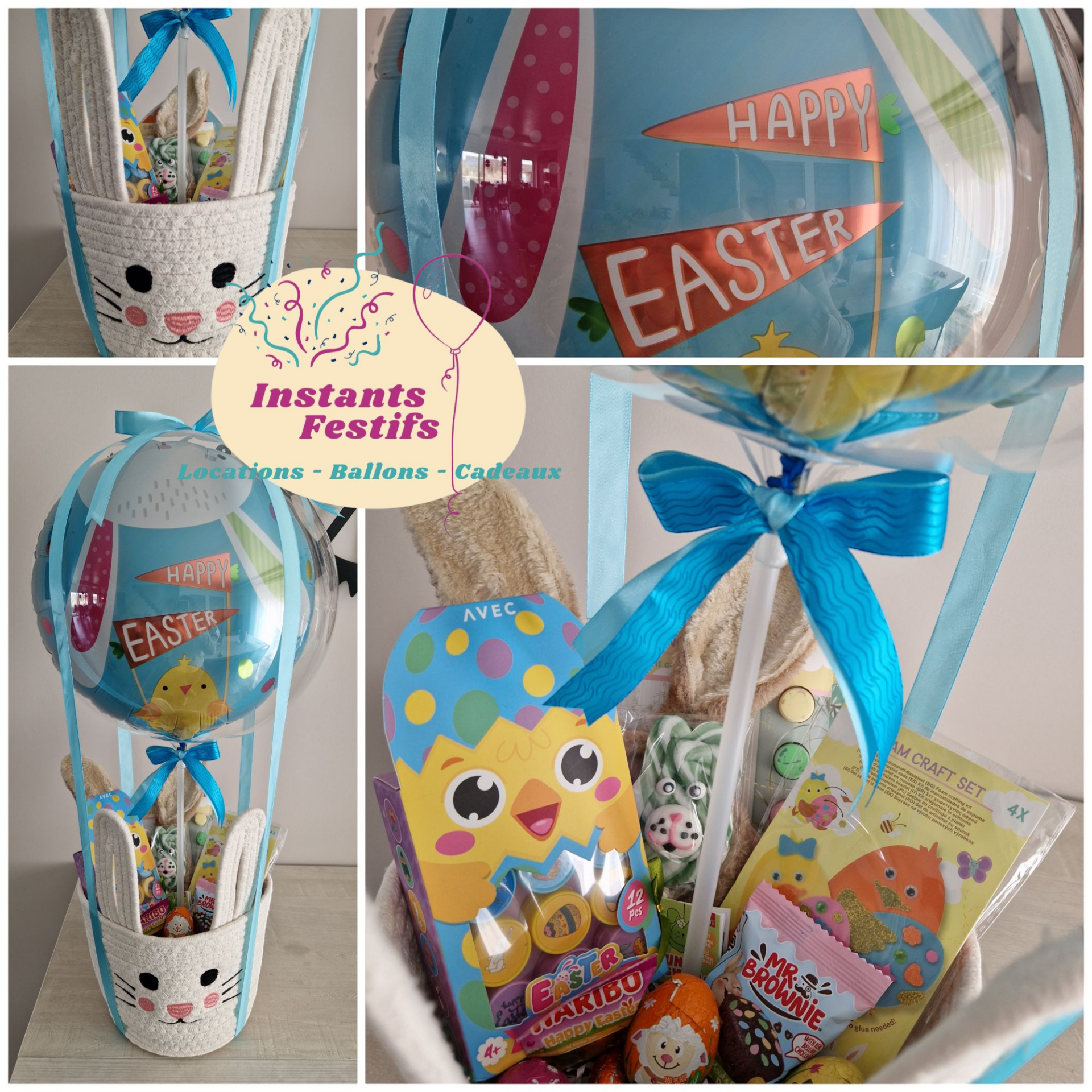 Panier en forme de tête de lapin remplis de diverses activités créatives autour du thème de Pâques. Comprends également quelques petites confiseries diverses.