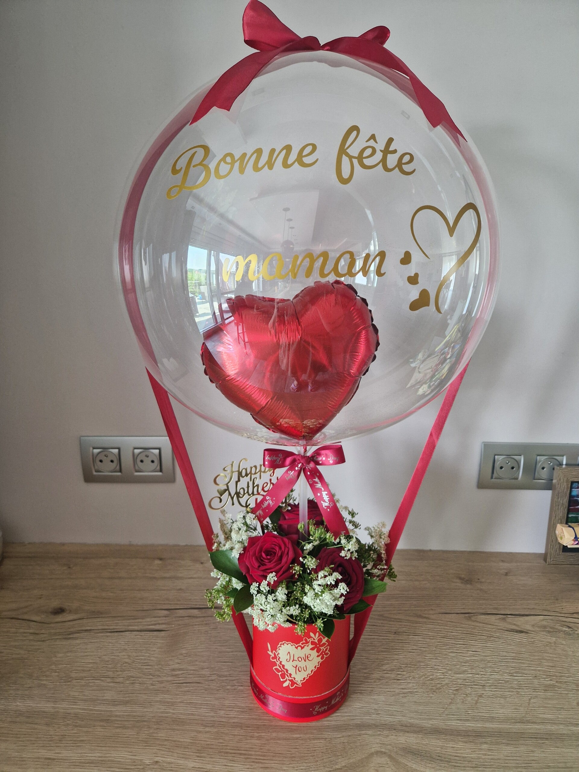 Cette composition florale, sobre et élégante saura toucher le coeur de votre maman. Toute en hauteur grâce à sa bulle, cette composition se démarquera du bouqte de roses classique.